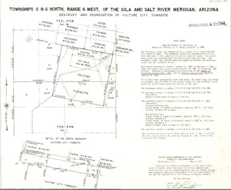 This survey plat shows the resurvey and segregation for the townsite of Vulture City. This resurvey was done in 1961 to update the original survey done by Herbert Patrick in 1880.