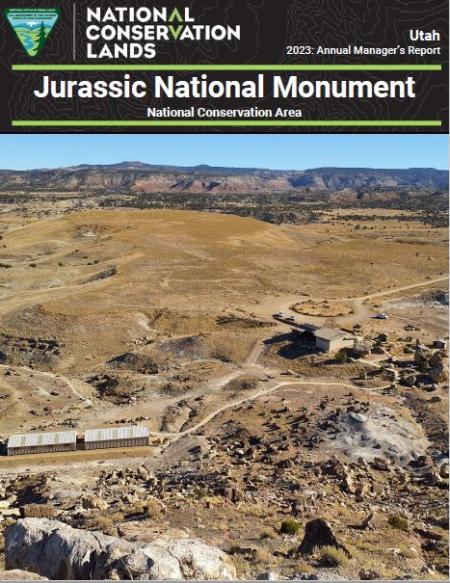 cover photo of Jurassic National monument depicting a topo black banner and cover photo of a barren brown landscape