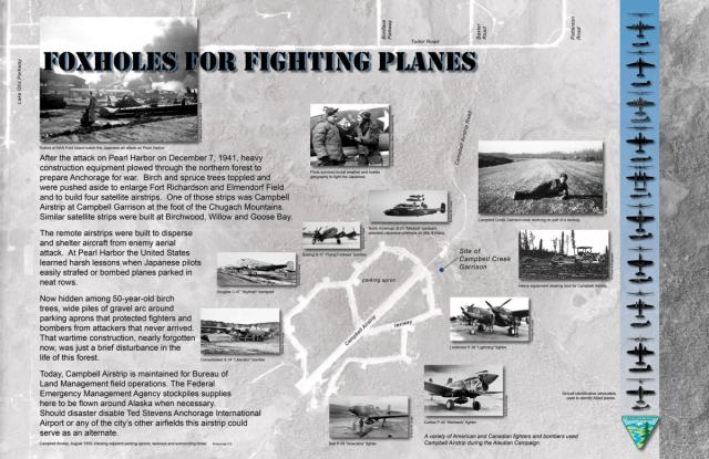 (The following text appears on the above panel)After the attack on Pearl Harbor on December 7, 1941, heavy construction equipment plowed through the northern forest to prepare Anchorage for war. Birch and spruce trees toppled and were pushed aside to enlarge Fort Richardson and Elmendorf Field and to build four satellite airstrips. One of those strips was Campbell Airstrip at Campbell Garrison at the foot of the Chugach Mountains. Similar satellite strips were built at Birchwood, Willow and Goose Bay.