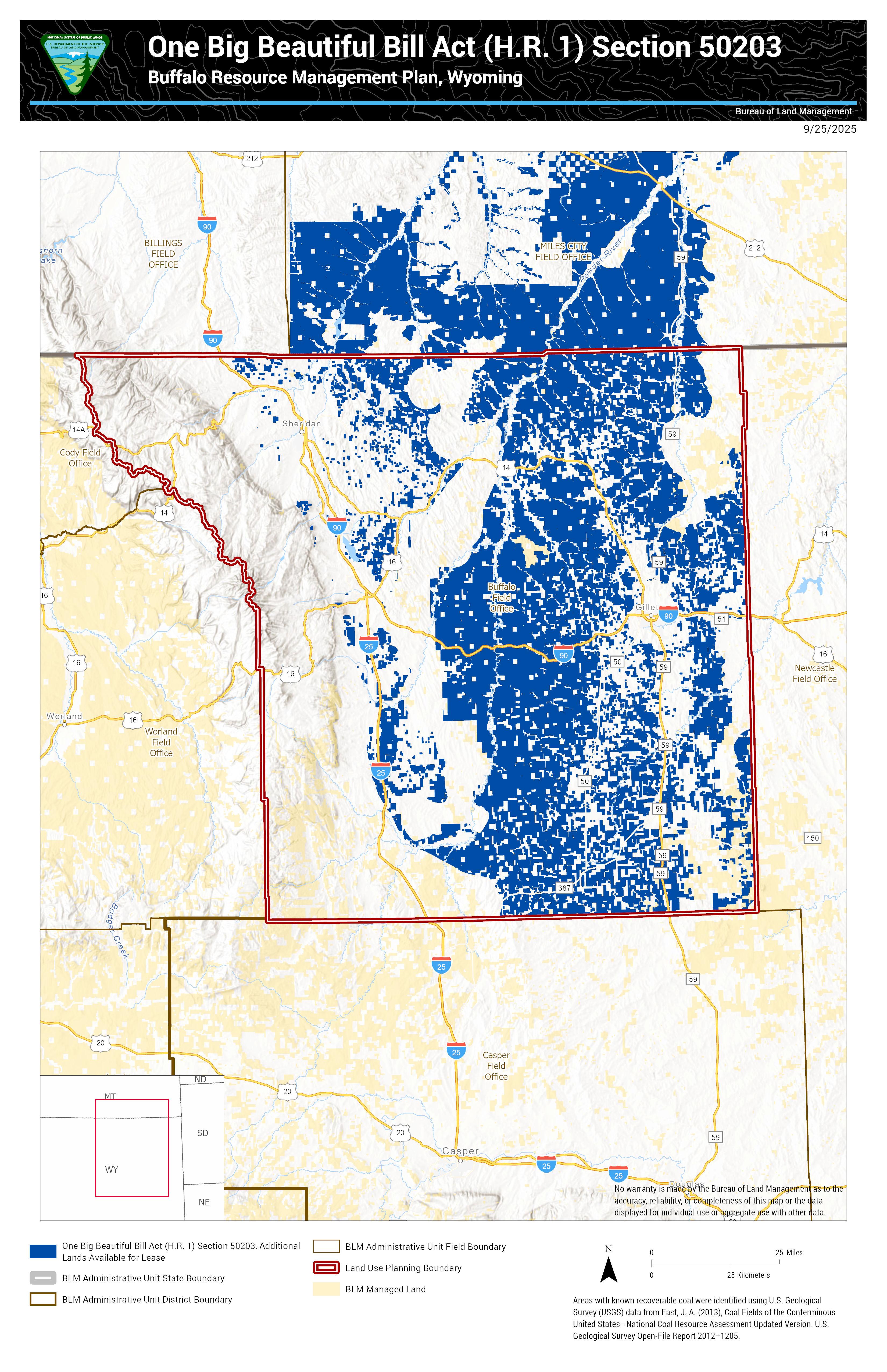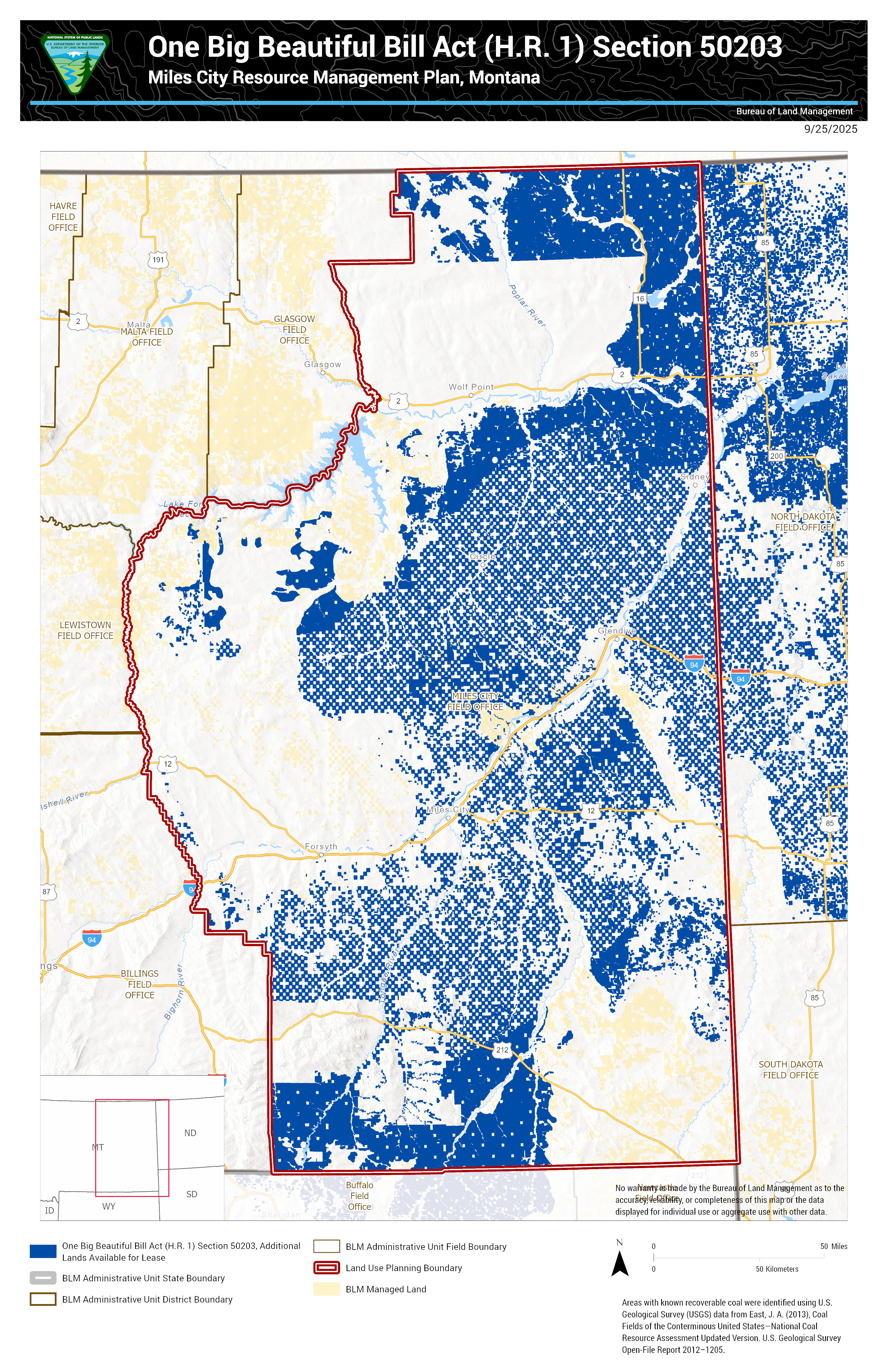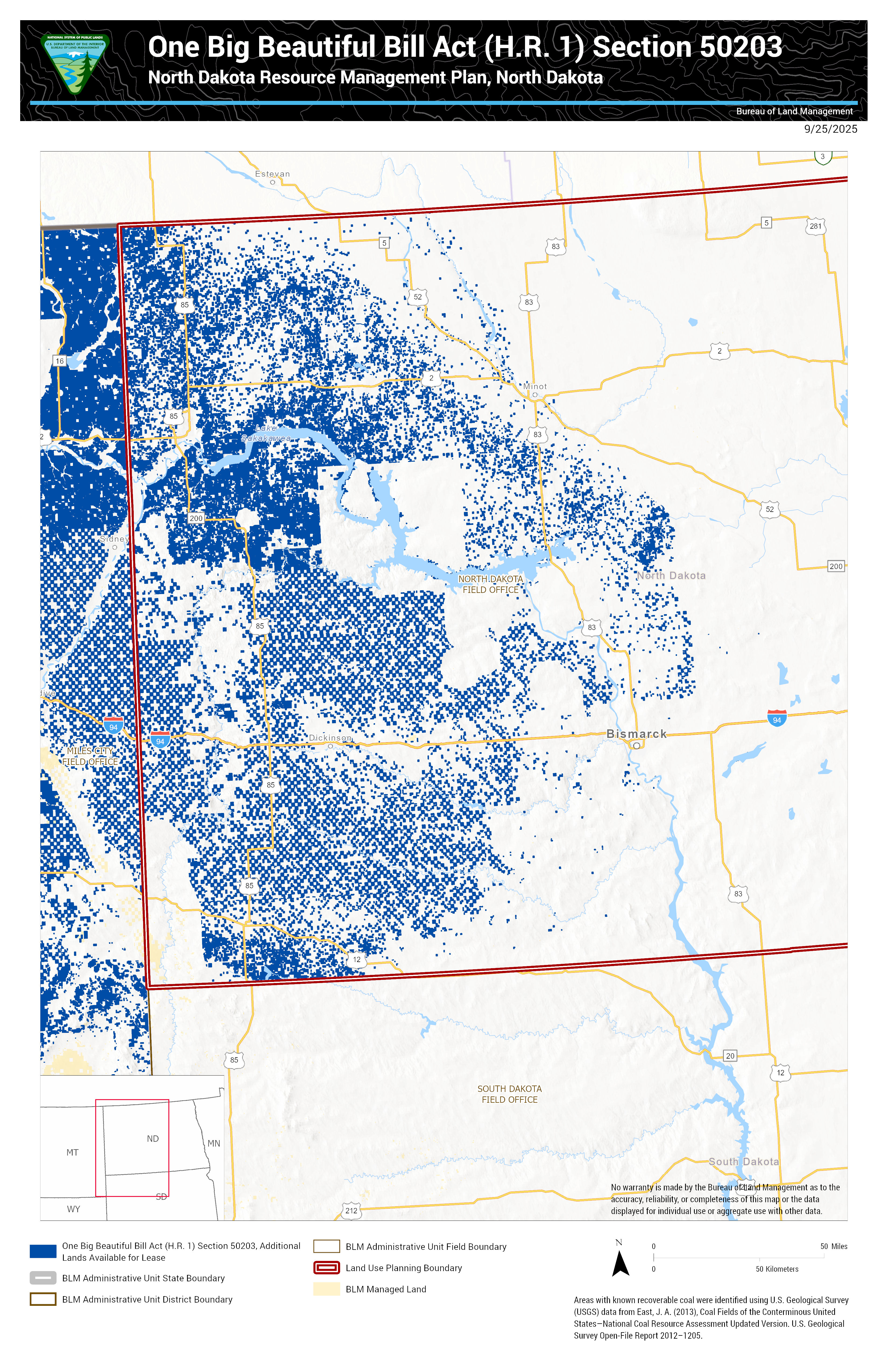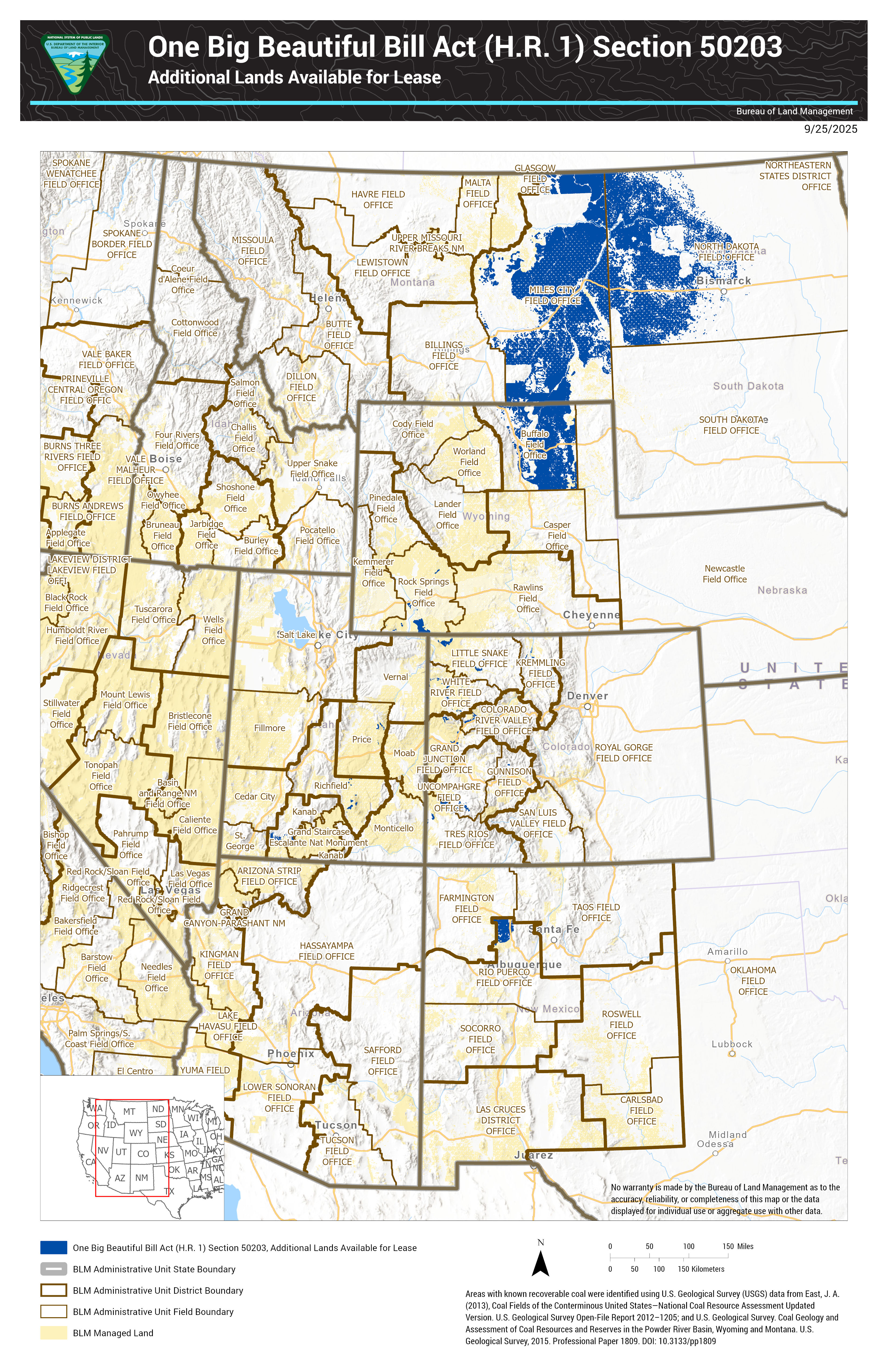 Under Section 50203 of the One Big Beautiful Bill Act (OBBBA), enacted on July 4, 2025, the Secretary of the Interior is making approximately 13,103,000 acres of Federal mineral estate available for coal leasing. This acreage, determined using GIS data, reflects the areas identified under the authority of OBBBA for potential leasing.