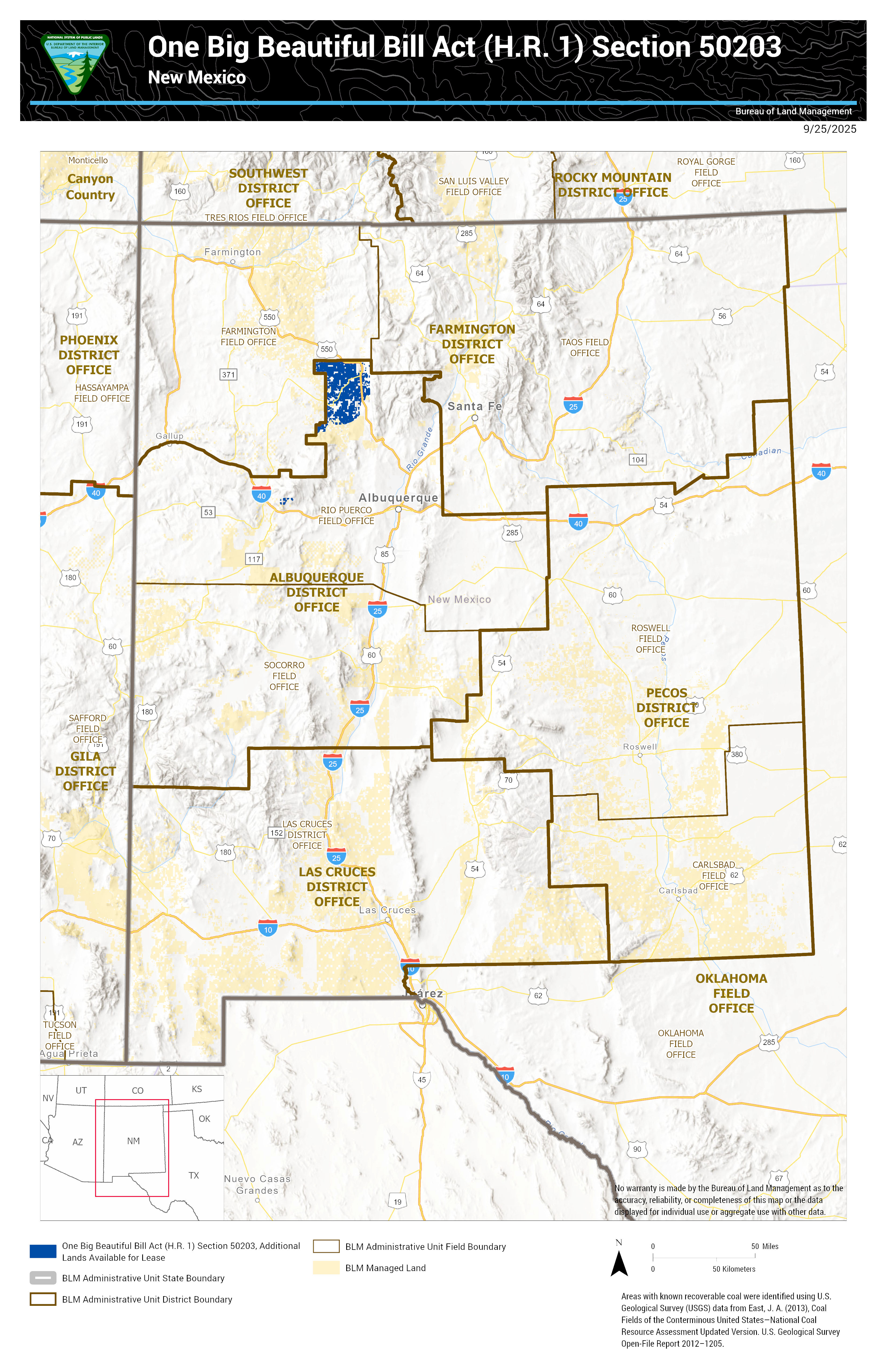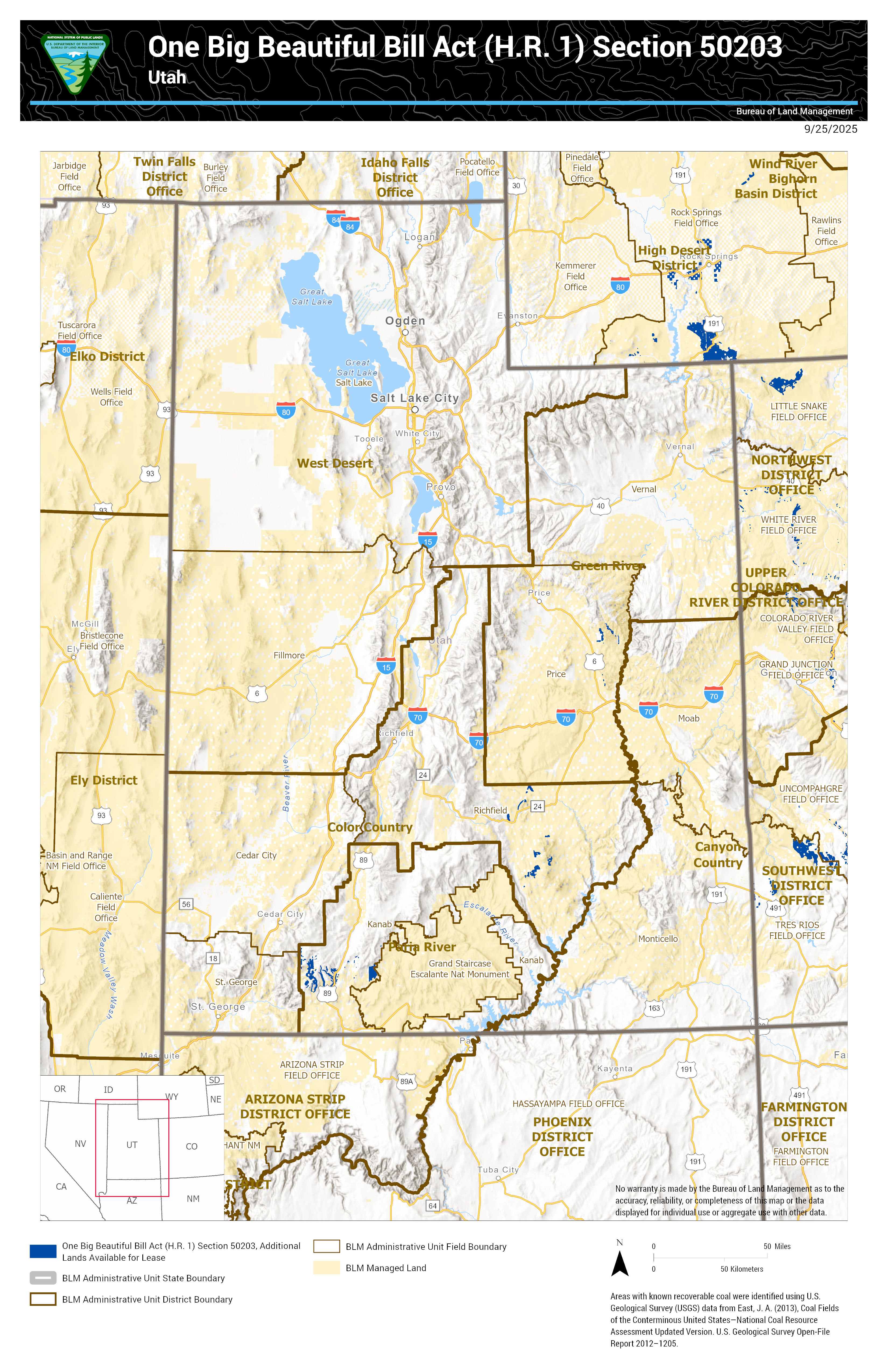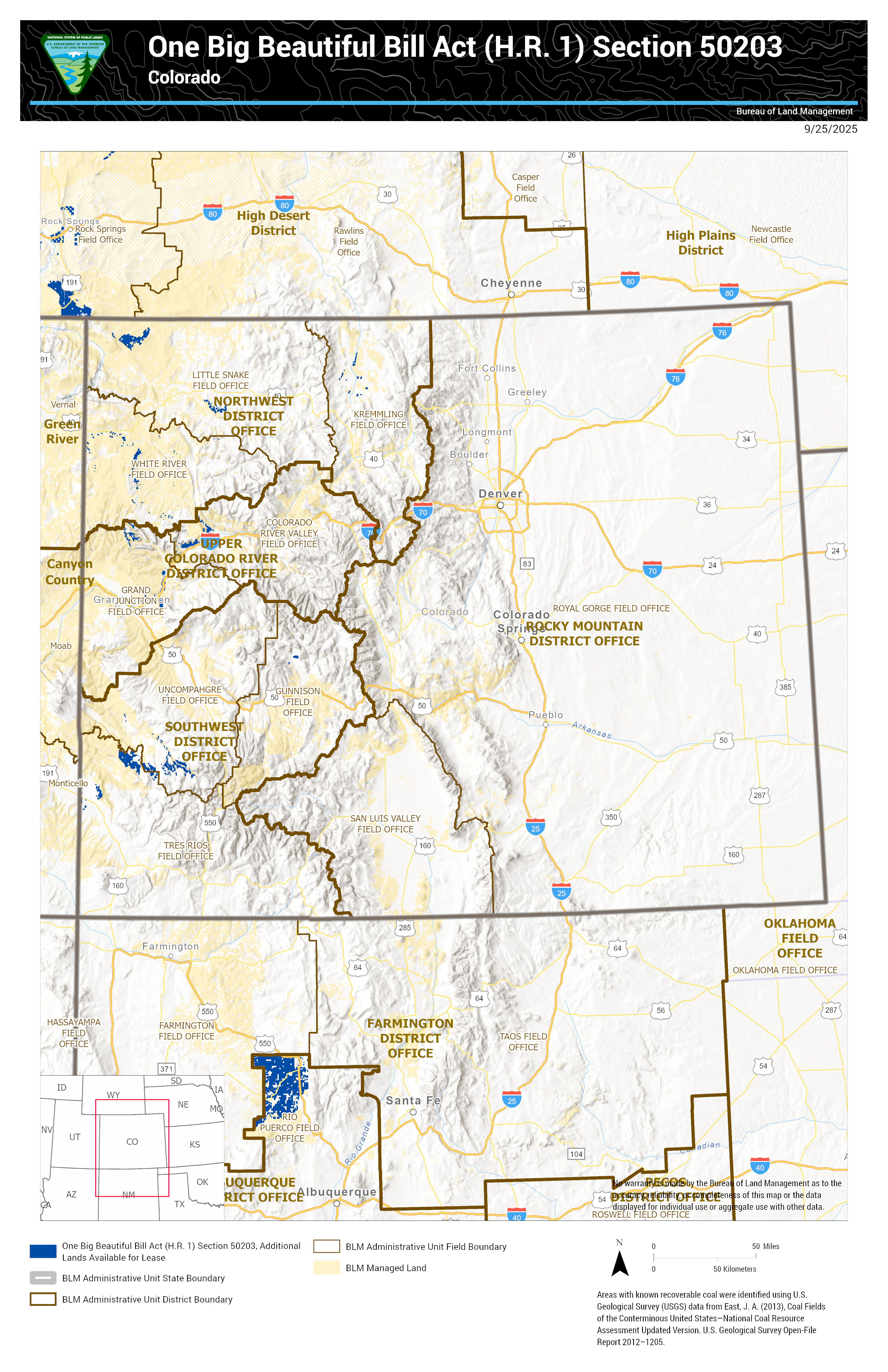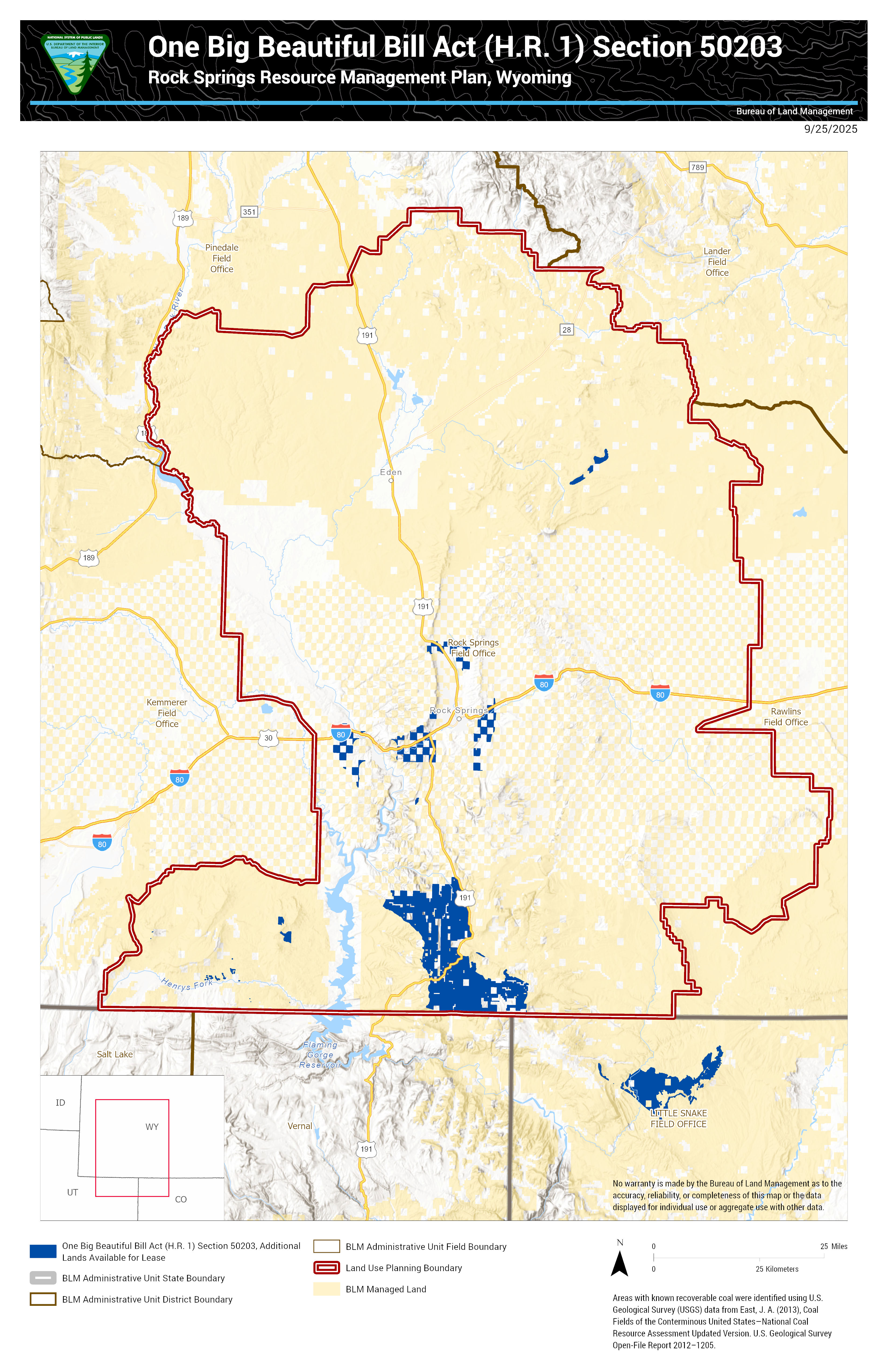 Under Section 50203 of the One Big Beautiful Bill Act (OBBBA), enacted on July 4, 2025, the Secretary of the Interior is making approximately 13,103,000 acres of Federal mineral estate available for coal leasing. This acreage, determined using GIS data, reflects the areas identified under the authority of OBBBA for potential leasing.