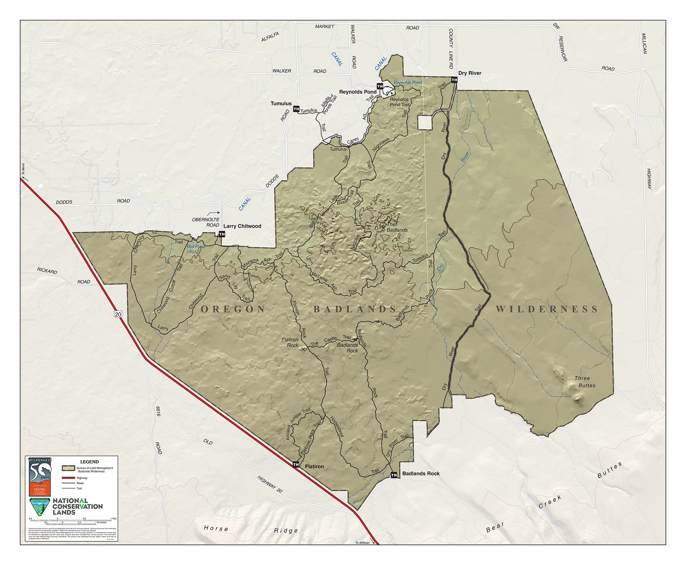 The Oregon Badlands Wilderness is topographically a gently sloping dome with mature juniper trees and modest rock outcrops providing vegetative screening and plenty of solitude. You will find few trail signs or markers but may see a number of user-created trails which do not appear on this map. Getting around can be challenging and visitors should be competent in land navigation skills.